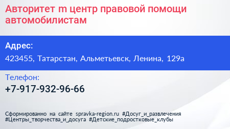 Авторитет.m, центр правовой помощи автомобилистам по адресу 423455, Татарстан, Альметьевск, Ленина, 129а в дальнейшем Организация, размещена в следующих категориях: