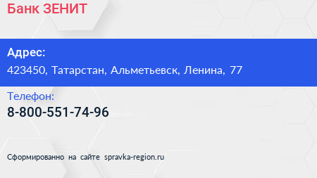 Банк ЗЕНИТ по адресу 423450, Татарстан, Альметьевск, Ленина, 77 в дальнейшем Организация, размещена в следующих категориях: