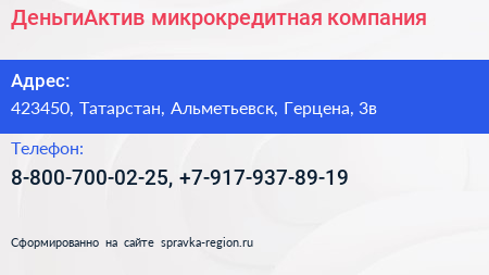 ДеньгиАктив, микрокредитная компания по адресу 423450, Татарстан, Альметьевск, Герцена, 3в в дальнейшем Организация, размещена в следующих категориях: