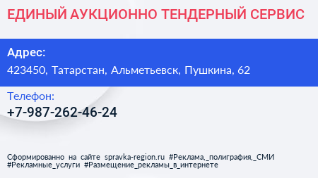 ЕДИНЫЙ АУКЦИОННО-ТЕНДЕРНЫЙ СЕРВИС по адресу 423450, Татарстан, Альметьевск, Пушкина, 62 в дальнейшем Организация, размещена в следующих категориях: