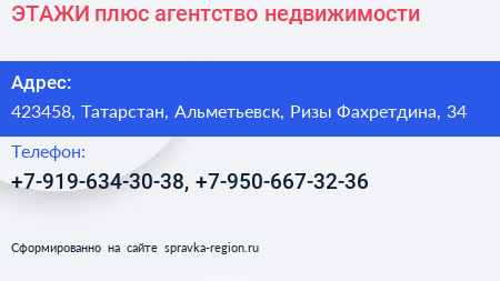 ЭТАЖИ плюс, агентство недвижимости по адресу 423458, Татарстан, Альметьевск, Ризы Фахретдина, 34 в дальнейшем Организация, размещена в следующих категориях: