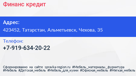 Финанс-кредит по адресу 423452, Татарстан, Альметьевск, Чехова, 35 в дальнейшем Организация, размещена в следующих категориях: