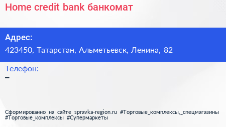 Home credit bank, банкомат по адресу 423450, Татарстан, Альметьевск, Ленина, 82 в дальнейшем Организация, размещена в следующих категориях: