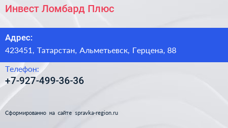 Инвест Ломбард Плюс по адресу 423451, Татарстан, Альметьевск, Герцена, 88 в дальнейшем Организация, размещена в следующих категориях: