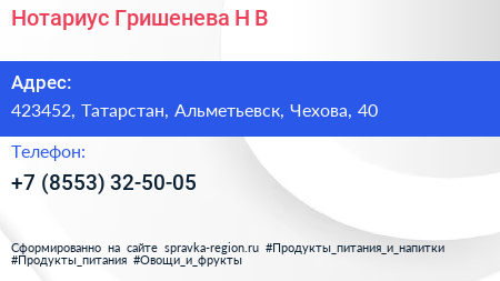 Нотариус Гришенева Н.В. по адресу 423452, Татарстан, Альметьевск, Чехова, 40 в дальнейшем Организация, размещена в следующих категориях: