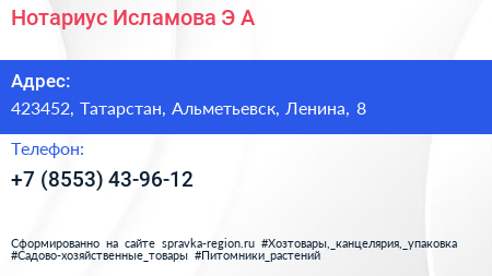 Нотариус Исламова Э.А. по адресу 423452, Татарстан, Альметьевск, Ленина, 8 в дальнейшем Организация, размещена в следующих категориях: