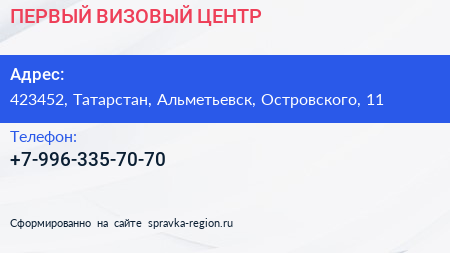 ПЕРВЫЙ ВИЗОВЫЙ ЦЕНТР по адресу 423452, Татарстан, Альметьевск, Островского, 11 в дальнейшем Организация, размещена в следующих категориях: