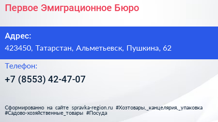 Первое Эмиграционное Бюро по адресу 423450, Татарстан, Альметьевск, Пушкина, 62 в дальнейшем Организация, размещена в следующих категориях: