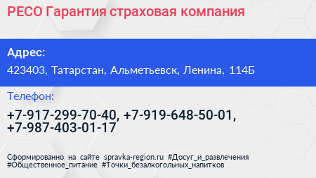 РЕСО-Гарантия, страховая компания по адресу 423403, Татарстан, Альметьевск, Ленина, 114Б в дальнейшем Организация, размещена в следующих категориях: