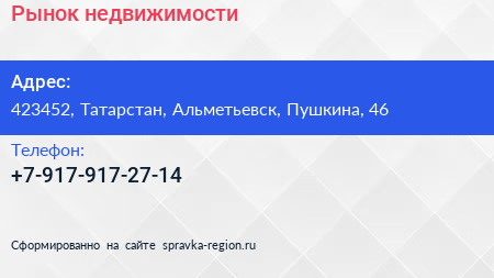 Рынок недвижимости по адресу 423452, Татарстан, Альметьевск, Пушкина, 46 в дальнейшем Организация, размещена в следующих категориях: