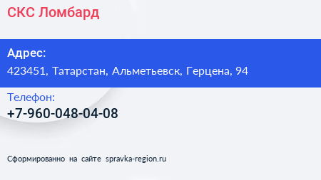 СКС Ломбард по адресу 423451, Татарстан, Альметьевск, Герцена, 94 в дальнейшем Организация, размещена в следующих категориях: