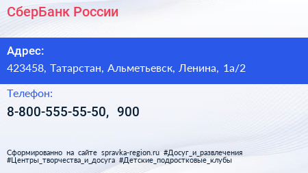 СберБанк России по адресу 423458, Татарстан, Альметьевск, Ленина, 1а/2 в дальнейшем Организация, размещена в следующих категориях: