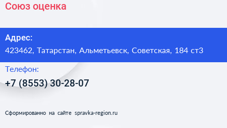 Союз-оценка по адресу 423462, Татарстан, Альметьевск, Советская, 184 ст3 в дальнейшем Организация, размещена в следующих категориях: