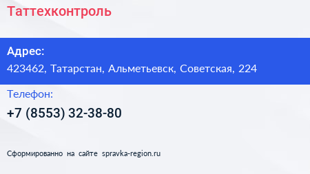 Таттехконтроль по адресу 423462, Татарстан, Альметьевск, Советская, 224 в дальнейшем Организация, размещена в следующих категориях: