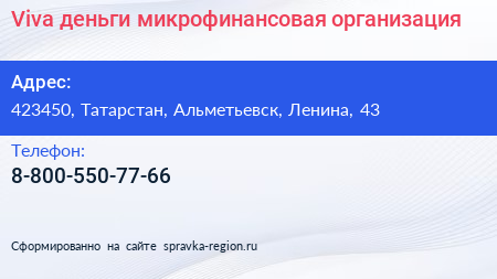 Viva деньги, микрофинансовая организация по адресу 423450, Татарстан, Альметьевск, Ленина, 43 в дальнейшем Организация, размещена в следующих категориях: