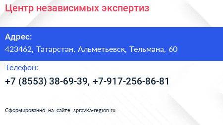 Центр независимых экспертиз по адресу 423462, Татарстан, Альметьевск, Тельмана, 60 в дальнейшем Организация, размещена в следующих категориях: