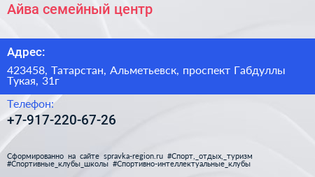 Айва, семейный центр по адресу 423458, Татарстан, Альметьевск, проспект Габдуллы Тукая, 31г в дальнейшем Организация, размещена в следующих категориях:
