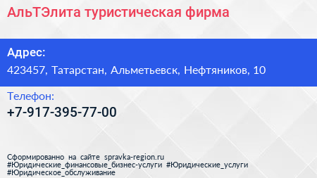 АльТЭлита, туристическая фирма по адресу 423457, Татарстан, Альметьевск, Нефтяников, 10 в дальнейшем Организация, размещена в следующих категориях: