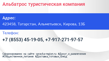 Альбатрос, туристическая компания по адресу 423458, Татарстан, Альметьевск, Кирова, 13Б в дальнейшем Организация, размещена в следующих категориях: