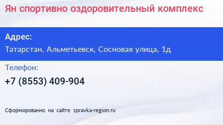 Ян, спортивно-оздоровительный комплекс по адресу Татарстан, Альметьевск, Сосновая улица, 1д в дальнейшем Организация, размещена в следующих категориях: