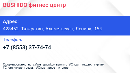 BUSHIDO, фитнес-центр по адресу 423452, Татарстан, Альметьевск, Ленина, 15Б в дальнейшем Организация, размещена в следующих категориях: