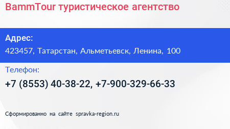 BammTour, туристическое агентство по адресу 423457, Татарстан, Альметьевск, Ленина, 100 в дальнейшем Организация, размещена в следующих категориях: