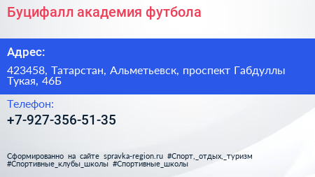 Буцифалл, академия футбола по адресу 423458, Татарстан, Альметьевск, проспект Габдуллы Тукая, 46Б в дальнейшем Организация, размещена в следующих категориях: