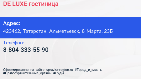 DE LUXE, гостиница по адресу 423462, Татарстан, Альметьевск, 8 Марта, 23Б в дальнейшем Организация, размещена в следующих категориях: