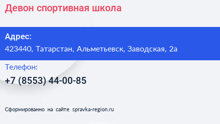 Девон, спортивная школа по адресу 423440, Татарстан, Альметьевск, Заводская, 2а в дальнейшем Организация, размещена в следующих категориях: