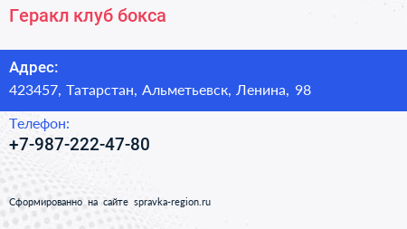 Геракл, клуб бокса по адресу 423457, Татарстан, Альметьевск, Ленина, 98 в дальнейшем Организация, размещена в следующих категориях: