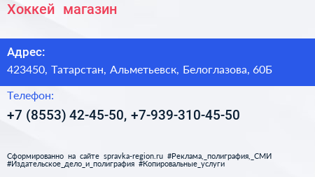 Хоккей+, магазин по адресу 423450, Татарстан, Альметьевск, Белоглазова, 60Б в дальнейшем Организация, размещена в следующих категориях: