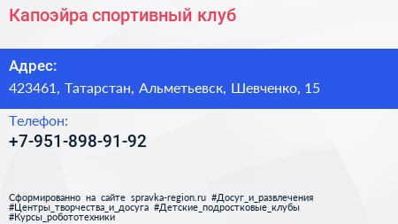 Капоэйра, спортивный клуб по адресу 423461, Татарстан, Альметьевск, Шевченко, 15 в дальнейшем Организация, размещена в следующих категориях: