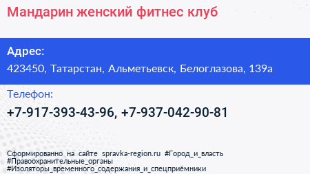 Мандарин, женский фитнес-клуб по адресу 423450, Татарстан, Альметьевск, Белоглазова, 139а в дальнейшем Организация, размещена в следующих категориях: