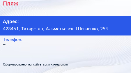 Пляж по адресу 423461, Татарстан, Альметьевск, Шевченко, 25Б в дальнейшем Организация, размещена в следующих категориях: