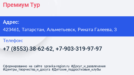 Премиум Тур по адресу 423461, Татарстан, Альметьевск, Рината Галеева, 3 в дальнейшем Организация, размещена в следующих категориях: