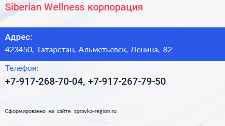 Siberian Wellness, корпорация по адресу 423450, Татарстан, Альметьевск, Ленина, 82 в дальнейшем Организация, размещена в следующих категориях: