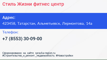 Стиль Жизни, фитнес-центр по адресу 423458, Татарстан, Альметьевск, Лермонтова, 14а в дальнейшем Организация, размещена в следующих категориях: