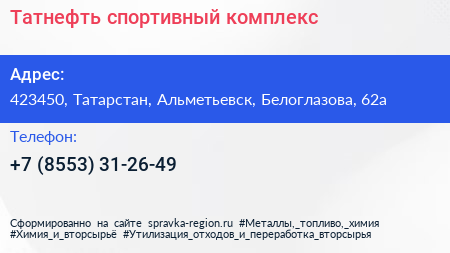Татнефть, спортивный комплекс по адресу 423450, Татарстан, Альметьевск, Белоглазова, 62а в дальнейшем Организация, размещена в следующих категориях: