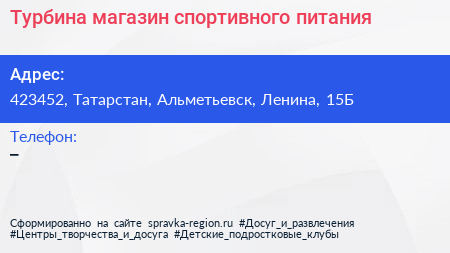 Турбина, магазин спортивного питания по адресу 423452, Татарстан, Альметьевск, Ленина, 15Б в дальнейшем Организация, размещена в следующих категориях: