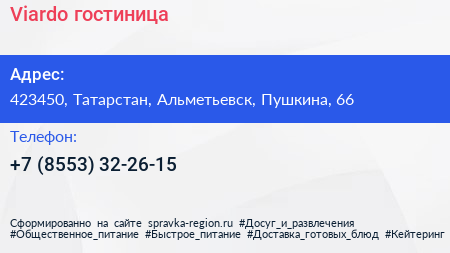 Viardo, гостиница по адресу 423450, Татарстан, Альметьевск, Пушкина, 66 в дальнейшем Организация, размещена в следующих категориях: