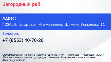 Загородный рай по адресу 423450, Татарстан, Альметьевск, Шамиля Усманова, 11 в дальнейшем Организация, размещена в следующих категориях: