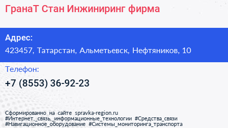 ГранаТ-Стан Инжиниринг, фирма по адресу 423457, Татарстан, Альметьевск, Нефтяников, 10 в дальнейшем Организация, размещена в следующих категориях:
