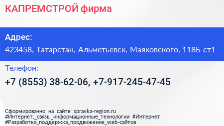 КАПРЕМСТРОЙ, фирма по адресу 423458, Татарстан, Альметьевск, Маяковского, 118Б ст1 в дальнейшем Организация, размещена в следующих категориях:
