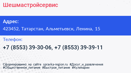 Шешмастройсервис по адресу 423452, Татарстан, Альметьевск, Ленина, 15 в дальнейшем Организация, размещена в следующих категориях: