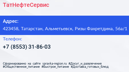 ТатНефтеСервис по адресу 423458, Татарстан, Альметьевск, Ризы Фахретдина, 56а/1 в дальнейшем Организация, размещена в следующих категориях: