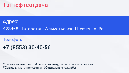 Татнефтеотдача по адресу 423458, Татарстан, Альметьевск, Шевченко, 9а в дальнейшем Организация, размещена в следующих категориях:
