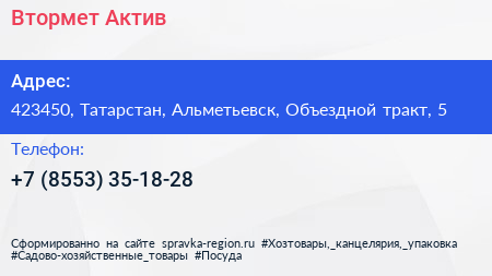 Втормет-Актив по адресу 423450, Татарстан, Альметьевск, Объездной тракт, 5 в дальнейшем Организация, размещена в следующих категориях: