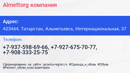 Almettorg, компания по адресу 423464, Татарстан, Альметьевск, Интернациональная, 37 в дальнейшем Организация, размещена в следующих категориях: