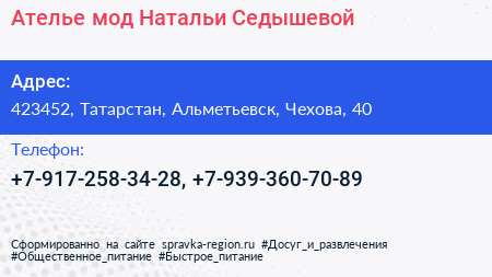Ателье мод Натальи Седышевой по адресу 423452, Татарстан, Альметьевск, Чехова, 40 в дальнейшем Организация, размещена в следующих категориях: