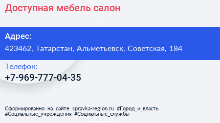 Доступная мебель, салон по адресу 423462, Татарстан, Альметьевск, Советская, 184 в дальнейшем Организация, размещена в следующих категориях: